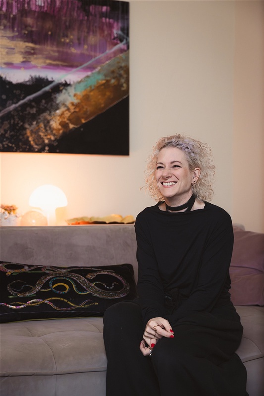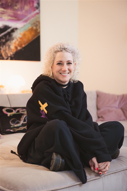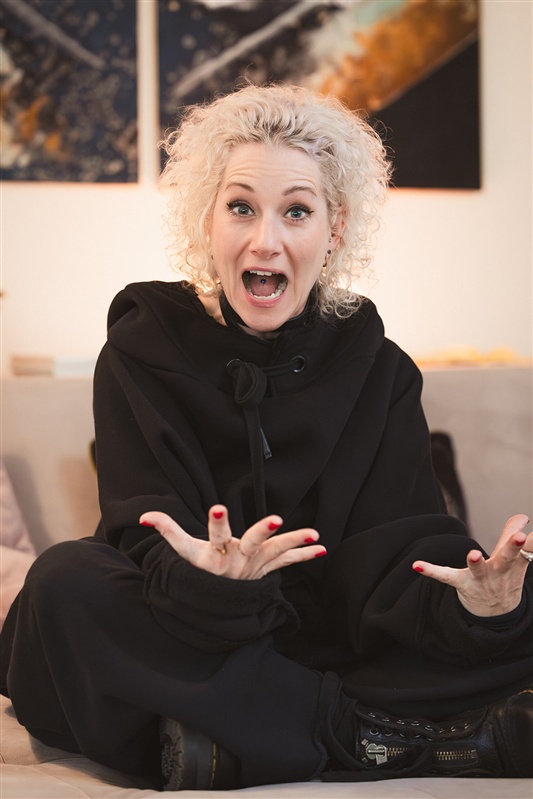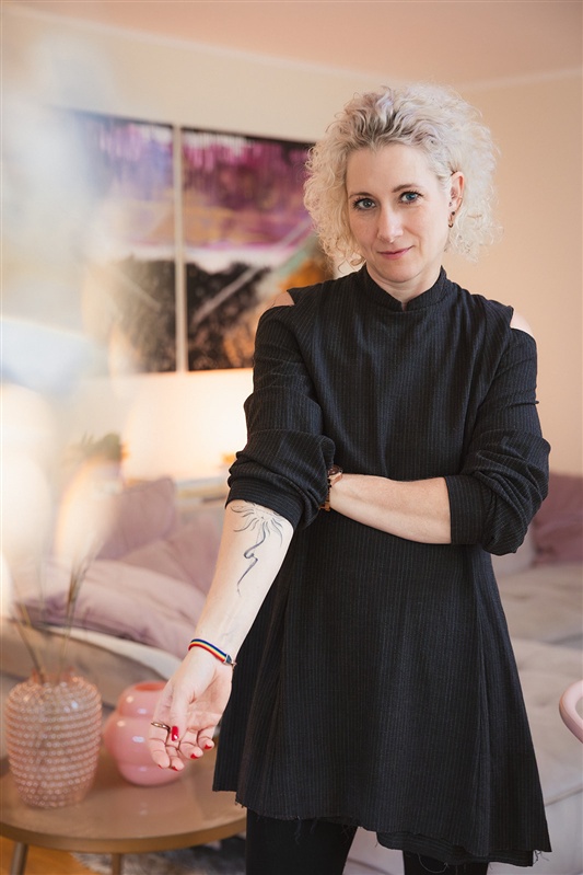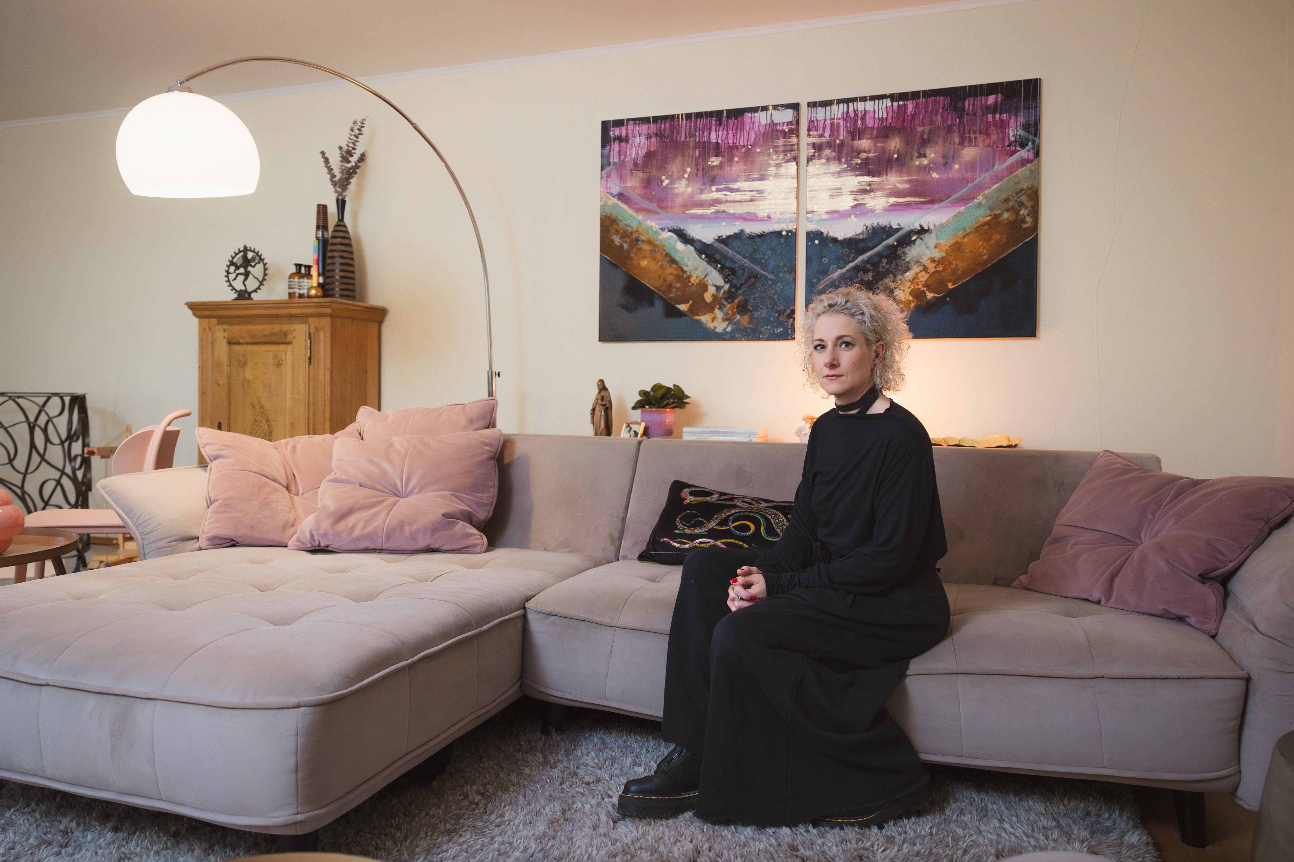 Ich lebe jetzt in Sankt Augustin Hangelar in einer lichtdurchfluteten Wohnung. Das Bild im Hintergrund ist von Siri Paflitschek, einer großartigen Künstlerin. Es ist ein Dyptichon, das sie für mich persönlich gemalt hat und eine echte Kraftquelle für mich ist. So soll es sein - mit echter Kunst und echter Kleidung.